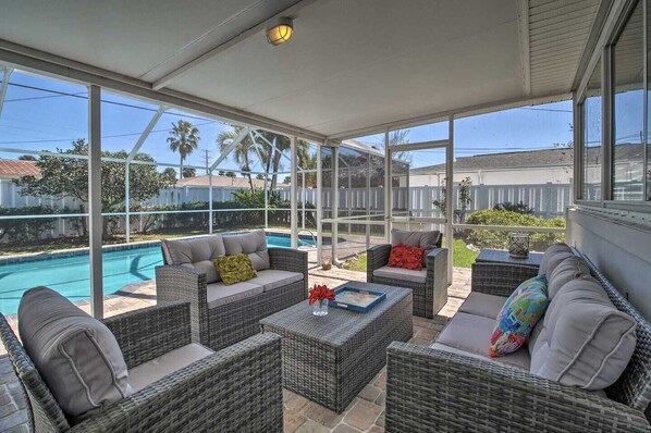 If you're a homebody, you'll be happy to know the property features its own private, solar heated pool! You won't have to travel more than a few steps to perfect your desired tan. Retreat to the screened-in patio for necessary shade, or host cocktail hour beside the flat-screen TV in the shaded patio area. When night falls, fire up the gas grill for a feast, followed by cocktails around the fire pit!