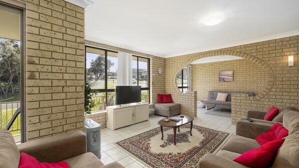 The large living area has a flat screen tv & four-seater lounge with ottoman. To the right of the main living area this another small living area with a fold out sofa bed. The kitchen has everything you need to be able to create your own meals on your holiday, with electric cooking appliances. The western end of the unit has one bedroom with two single beds. The eastern end of the unit consists of the main bedroom that has a queen bed, second bedroom with tri bunk & single bed & large bathroom with separate toilet.