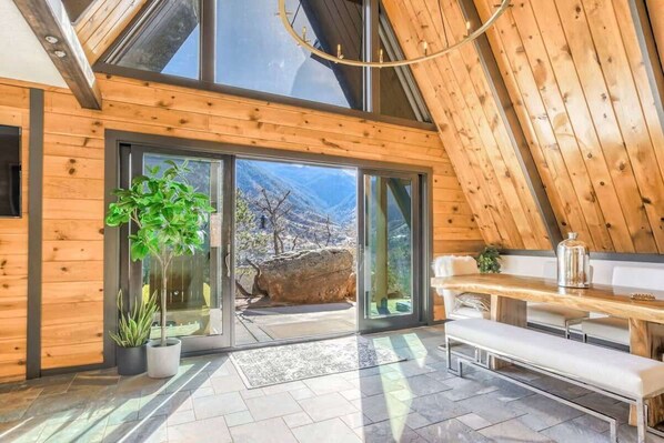 The living space flows into a dining area, in the “A” frame heart of the home, where two stories of windows provide a truly awesome view at mealtimes. The pine paneling lends a quintessential “mountain house” vibe. A long dining table with banquette seating on one side and a bench on the other offers intimate seating for unhurried dinners and indulgent group conversation.