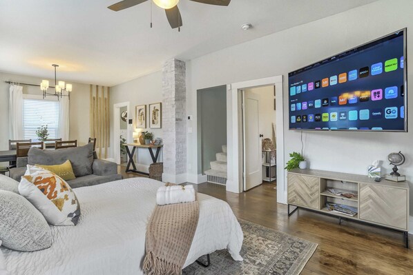 Discover two additional bedrooms, thoughtfully designed with ample luggage space, Smart TVs, and additional box fans for your comfort. Dimmable lighting ensures a cozy ambiance, while the newly renovated bathroom offers crisp cleanliness and modern amenities.