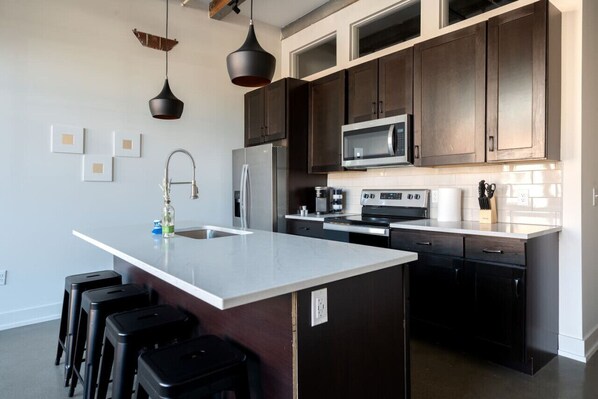 Guests are treated to tall ceilings, exposed brick and beams, large windows (with coverings), all with a chic industrial vibe and curated local décor. All lofts are oversized! You will love the space. Work or play, this loft has you covered! - Large Smart TV in Living room - Tv in bedrooms - 2nd bed is a Queen air mattress ( we buy the nice ones :) ) - Keurig coffee maker and pods - Full kitchen w/ Dishwasher - Full size private laundry in unit - Large tile shower and bathroom. - Fast Wi-fi