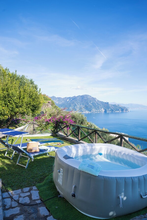 Il giardino in erba naturale è perfetto per abbronzarsi sulle comode sedie sdraio, se poi dovesse fare troppo caldo ci si può rinfrescare con la doccia esterna, ripararsi all’ombra di tipici alberi di mandarino o fare un bagno nella spaziosa jacuzzi (disponibile da marzo a fine ottobre, eventualmente disponibile anche negli altri periodi su richiesta).