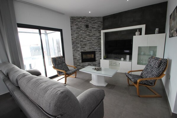 Living room with comfortable sofas, fireplace with heater, dining table and chairs, satellite TV, wifi (fibre optic) and air conditioning. The air conditioning has a 3h timer, in this case it can be used for 24h if necessary, but the air has to be reactivated every 3h. From June to September the cost of air conditioning is included in the price. In the other months it can be included with a supplement of 7.50 EUR per day.