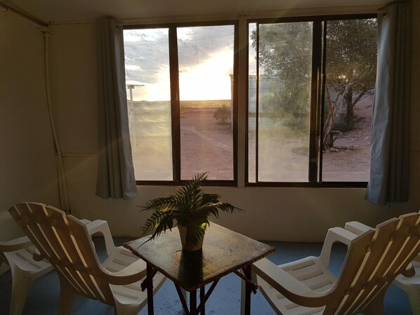 Light filled, large and very comfortable. The temperature may be 6 days of over 45 degrees (as it is right now while I'm typing this) ... BUT INCREDIBLY the inside of the house is a pleasant 23-24 degrees!! - it's not at all stuffy, the air is fresh and stone filtered. It's just perfect temperature ALL YEAR ROUND!! - we do have an air conditioner, but it's really just so people who don't believe us feel secure. You don't really get the true Coober Pedy Underground Living experience if you don't trust me. You'll never feel a place Welcome you inside, like a dugout does on a hot day! The other great thing about this dugout is its fully enclosed, bug and fly free, inside-outside verandah room... It can double as a spare room if someone in your group is initially worried they won't feel comfortable underground - WHICH WON'T HAPPEN ONCE THEY PEER INSIDE!! - Meaning you don't have to spend all day convincing someone in the group that they WON'T feel claustrophobic or scared in our dugout. The room has been set up to enjoy the space outside a dugout, the sunset and the electric BBQ grill.