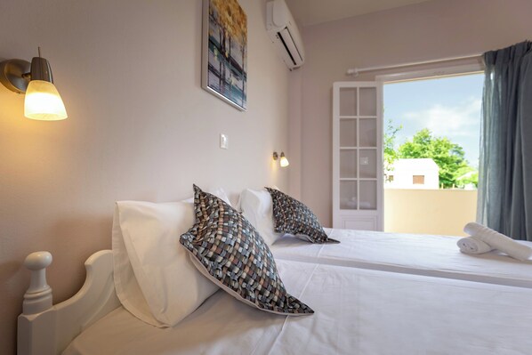 KARMA is a ground floor single-bedroom apartment with two single beds, private kitchen, a bathroom and a terrace with unobstructed views of the beautiful manicured garden. Free use of the laundry room and parking area on the premises. The well-lit garden in the evening is the perfect background to enjoy a sip of good wine or taste a local beer. In Relax Studios Corfu - Karma, you will taste Greek hospitality at its best!