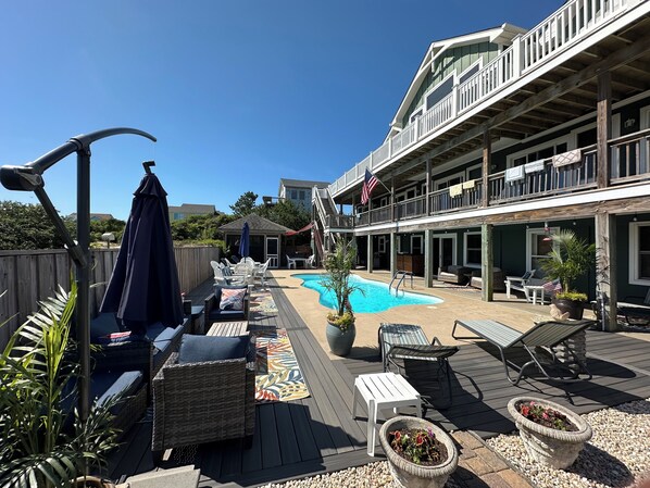 Located in Ocean Sands Corolla, Private spacious open floor plan house is a dream. Kitchen with all the cooking essentials for a chef, plenty of seating along with Den area, office/TV room, pool table in game room, Sit and relax on 70 feet of ocean side decking while watching the sunrise with panoramic ocean views and Private open space, With 6 bedrooms including 4 king beds, 2 queen beds, 1 Twin Trundle and Twin Foldaway, guests will have plenty of space to relax. The 6 full bathrooms complete with hair dryers and one master jetted jacuzzi bathtub, ensure everyone's comfort. One half bath has access to pool area . An additional quiet office/tv space with a twin foldaway and sofa provides extra flexibility. The backyard pool area is an oasis with screened in dining area covered seating and plenty of Sun loungers for all not to mention lots of privacy, heat salt water pool at no charge ( heats up to 10 degrees of ambient temperature) and Hot Tub . With many amenities including beach chairs, boogie boards, wagon, community tennis, 4-6 minute walk to beach and tennis. Enjoy all that Corolla has to offer with short two minute drive or walk/ Bicycle to Harris Teeter Grocery Shopping Center, Starbucks and quaint shops. Ice Cream Shop, Duck Donuts , Urban Kitchen Restaurant or Off the Tap Restaurant , Wings Retail Shop for all your beach necessities. Drive to Corolla Historic Village to walk around the Lighthouse, quaint shops, Nature Museum, beautiful sunset views sound side great for crabbing with the children and grab a cup of fresh ground coffee or Hot Chocolate at the Kind Cup while strolling through quaint shops. Also Wild Horse Tours in 4x4 North Beach and Fishing Charters !!