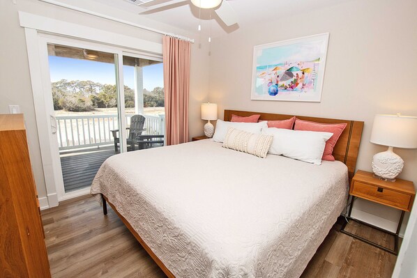 Top Level: Great Room with flat-screen TV, kitchen with counter seating for 4, dining area seating 8 with deck access and a half bathroom between levels. King Master Bedroom with flat-screen TV, private bathroom and private deck access.
