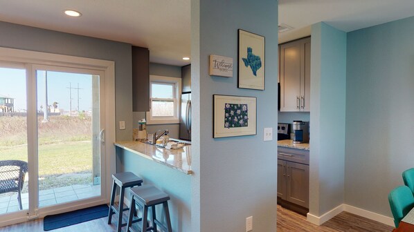 Casa Azul is a newly remodeled ground floor, 2-bedroom condo in town near the Marina. This condo has soothing blue walls with hints of modern floral and island touches throughout. An open floor plan is perfect for gathering and entertaining and never having to miss out on a conversation or fun. The full kitchen is stocked with stainless steel appliances, a Keurig, spacious granite countertops, basic pots, pans, dishes, and utensils for all of your culinary needs. Adjacent is the dining table with seating for four to enjoy meals or play a friendly game of cards. There is additional seating for two at the bar. The living room is comprised of an oversized couch with plush pillows, a matching armchair, and two ottomans, made for relaxing and watching the large TV with cable and Wi-Fi. Sip your morning coffee or evening beverage on the back patio. The guest bedroom (BR1) contains a Queen bed, nightstands, closet, and desk for working remotely or for distance learning assignments. The hallway bath has a large granite countertop, sink, and tub/shower. The master bedroom (BR2) includes a King bed, nightstands, and a closet. The ensuite bathroom has a separate vanity area from the large tile shower with a glass door. For your convenience, there is a full-size washer and dryer tucked neatly behind a door at the end of the hallway. This area also has access to the master bathroom. The shared pool, hot tub, and grilling area are just across the parking lot from the front door. There is boat parking right next to the building in which this unit is located. Enjoy the close walking proximity to the Marina and Charlie's Pasture to watch the dolphins. Shops, restaurants and bars are only 0.5 miles away. Revel in our Port A scenery while taking a short 1.3-mile drive to the beach.