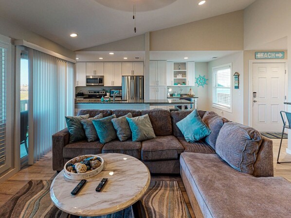 Book your next stay at Ferry Retreat, a newly remodeled second-floor condo in town near the Marina. This condo is decorated with a beach and oceanic theme with modern touches and built-ins throughout. The open floor plan is perfect for gathering and entertaining and never having to miss out on a conversation or fun. The full kitchen is stocked with stainless steel appliances, spacious granite countertops, a toaster, a toaster oven, a Keurig and drip coffee maker, pots, pans, dishes, and utensils for all of your culinary needs. Utilize the desk area for working from home or distance learning. The extended breakfast bar has seating for four. Adjacent to this area is a unique sidebar along the wall with additional seating or four. The living room is comprised of a large sectional with chaise and plush pillows, made for relaxing and watching the large wall-mounted TV with cable and Wi-Fi. Sip your morning coffee on the balcony while watching the ships pass through the nearby channel. The guest bedroom (BR1) contains a Twin over Full bunk bed, a single Twin bed, a nightstand, and a wall-mounted TV. The hallway bath is equipped with a large granite countertop, sink, and tiled tub/shower. The master bedroom (BR2) includes a King bed, nightstands, chest, chair for reading a book, closet, and wall-mounted TV. The ensuite bathroom consists of double vanities, separate from the stand-alone tile shower with a glass door. For your convenience, there is a full-size washer and dryer tucked neatly behind a door at the end of the hallway. The shared pool, hot tub, and grilling area are just across the parking lot from the front door. Enjoy the close walking proximity to the Marina to watch the dolphins. Shops, restaurants and bars are only 0.5 miles away. Revel in our Port A scenery while taking a short 1.3-mile drive to the beach.