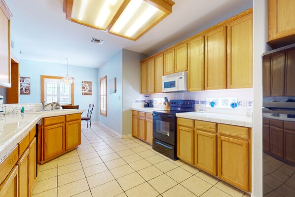 When it's time to refuel, our fully stocked kitchen has everything you need to whip up delicious meals and snacks. With ample countertop space, preparing food will be a breeze.