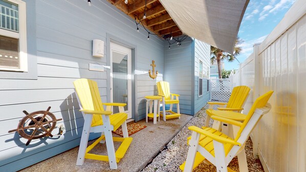 We were very happy with our stay at this fun beach condo, It was clean and well decorated with nice (but comfortable!) beach themed furnishing, a place for everyone to sit in the living room and plenty of bed space. As a bonus it had a nice outdoor back patio we didn't expect, with seating for several and a grill. Communication and check-in/check-out was easy, would definitely stay here again.