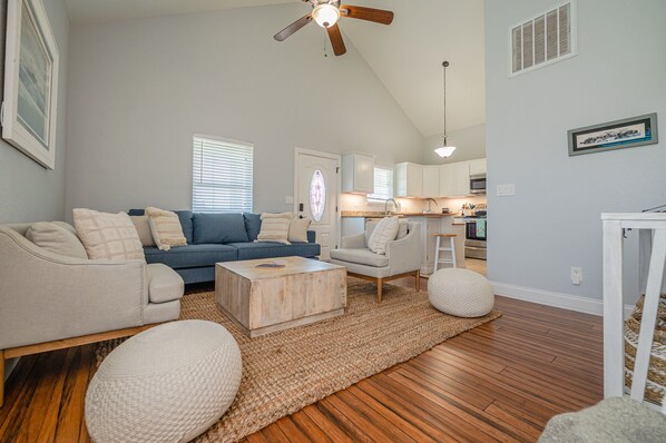 Bright & Airy Living: Walk into a sun-drenched living room that seamlessly flows into a fully equipped kitchen – your perfect home away from home, ready for creating delicious meals and lasting memories.