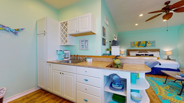 Conveniently located in Island Retreat. “Under The Sea” is a delightfully decorated spacious studio condo that sleeps four comfortably. This much sought after first floor condo has charming furnishings, and colorful coastal hues.