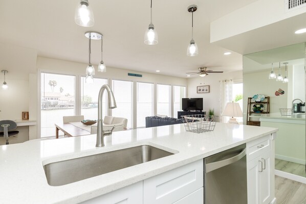 The fully equipped kitchen features a Keurig coffee maker, cookware, and seating for eight. Enjoy meals at the dining table or relax with a cup of coffee on your private patio while overlooking the canal.