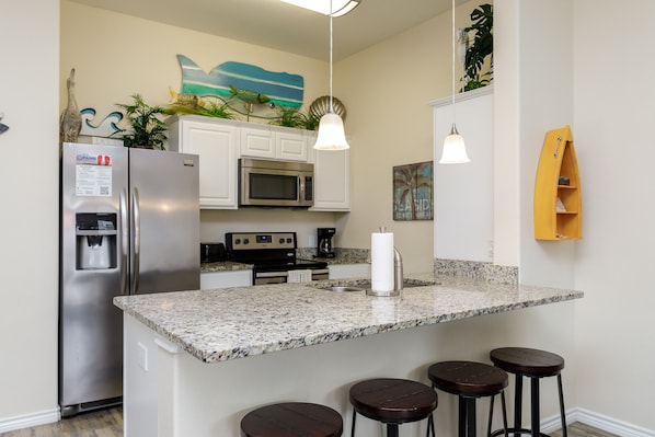 Guests love Augie’s Escape for its bright, poolside location and private patio perfect for morning coffee or evening relaxation. The open concept living space combines comfort and style with modern touches throughout. Families and groups appreciate the proximity to the beach, two heated pools, and thoughtful amenities like Apple TV and stocked beach gear. It’s an ideal retreat for making memories on Padre Island.