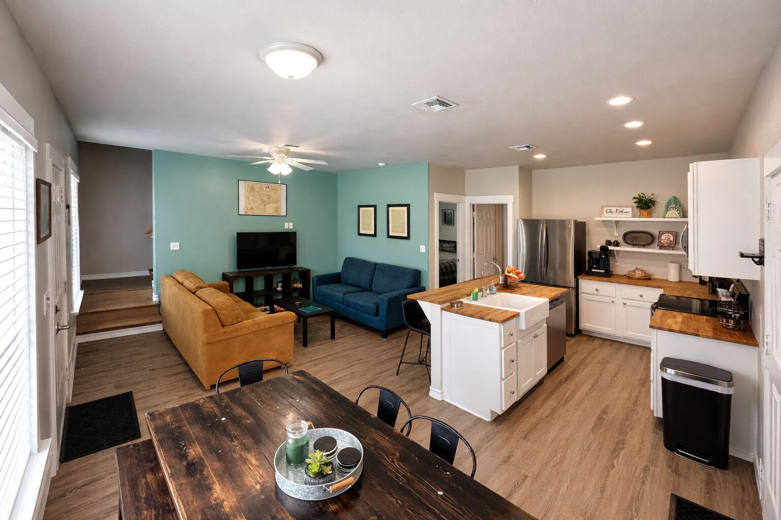 Dining room and kitchen have a open floor plan with bar seating for 4. Dining room has a family table that accommodates 6.