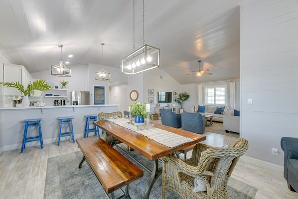 This bright and airy, 1,614-square-foot Port Aransas home is ideal for families, as it features comfortable home essentials, a gourmet kitchen, and a pool to splash your cares away.