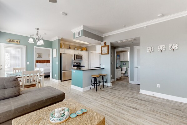 Delightfully decorated in a fun nautical theme, the interior of the condo features an open layout and ample natural lighting. Sit back and stream your favorite shows from the comfort of the oversized living room sofa. When you aren't dining out, the well-equipped kitchen makes cooking a breeze with its stainless steel appliances. Both a breakfast bar and dining table are available when you are ready to dine.