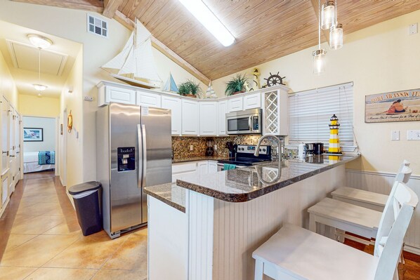 The open-concept living room is accentuated by vaulted timber ceilings and cool tiled floors. Prep meals in a stylish kitchen with stainless steel appliances and granite countertops. Pull up beachside-style stools at a kitchen breakfast bar before heading out for a day beside the sea. Later, gather for evening meals around the dining table.