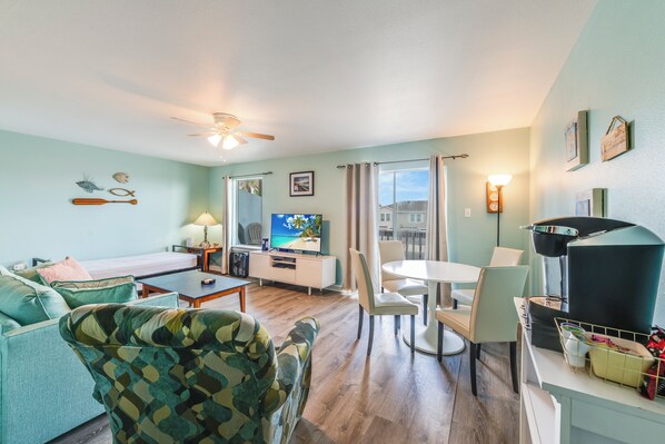 Unwind in coastal comfort in our inviting living room, featuring plush seating and a flat-screen TV with cable for cozy nights in.