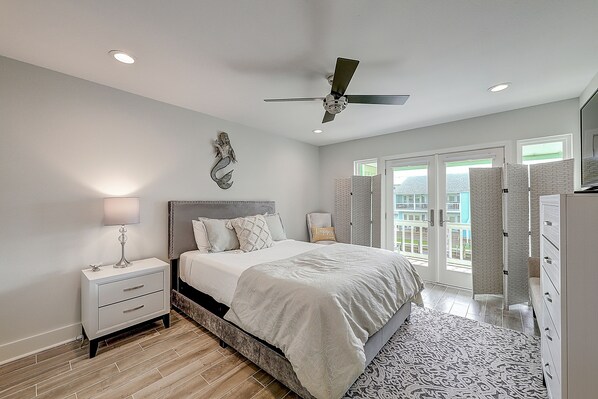 Inside this second-story condo, you'll find an open floor plan set beneath a vaulted ceiling that includes a well-equipped, full kitchen with stainless steel appliances, a dining area with a table for four for mealtimes or rainy day board games, and a comfortable living area with a sectional sofa and a TV for streaming your favorite channels.
