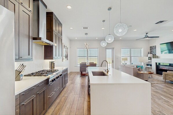 The interior is polished and comfortable, with the main living area anchored by a beautiful kitchen. This open space features professional-grade appliances (including a gas range, dishwasher, and a multi-door-and-drawer refrigerator), a large island with seating, and an adjacent glass-top dining table. There are two light-filled living rooms, each with a gas fireplace, wet bar, TV, and deck access. Central air conditioning will help keep everyone cool and comfortable. Additional features include a washer/dryer, complimentary WiFi, and elegant bedrooms.