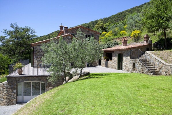 Offering a true countryside escape in idyllic Tuscany, Olivetani is a beautifully restored historic villa that blends original charm with modern comfort. Set peacefully on a green hillside and surrounded by trees, it promises total tranquillity - yet the vibrant hilltop town of Cortona is only a short drive away.Spread across three floors, the villa sleeps up to 11 guests in six characterful bedrooms. The two luxurious lower-ground-floor bedrooms each feature an en-suite bathroom and offer direct access to the villa’s impressive gym and spa facilities, giving lucky guests a private wellness retreat. The remaining bedrooms and living areas celebrate traditional Tuscan craftsmanship, with wooden beam ceilings, terracotta tiles, whitewashed walls and rustic furnishings that create cool, inviting spaces.The open-plan living/dining room flows seamlessly onto the garden through large doors, opening onto a charming terrace with an outdoor kitchen and dining area. Whether gathering inside at the elegant table or enjoying meals al fresco, guests can savour views of the lush grounds. The expansive garden is a tranquil haven of greenery, complete with a swimming pool overlooking the rolling hills.Despite its secluded feel, Olivetani is ideally placed for exploring the region. Nearby Cortona offers shops, restaurants, artisanal goods and local wines from Montepulciano. Historic cities such as Perugia and Città di Castello can be reached in under an hour - perfect for chocolate lovers and art enthusiasts alike. For nature seekers, the beautiful landscapes and wildlife of Lake Trasimeno Regional Park are just 30 minutes away.With serene surroundings, elegant interiors and excellent facilities, Olivetani delivers an unforgettable retreat in the heart of Tuscany.