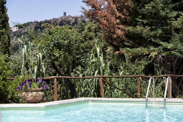 Protetta dall'alto dalla cinta muraria etrusca, Villa Serena (250 mq.) guarda ai suoi piedi la torre alta a merlatura ghibellina del rinascimentale e principesco Palazzone, di fronte l'immensa Valdichiana, chiusa dai profili azzurri e sinuosi dell'antiappennino, dominati dal cono perfetto dell'Amiata, dai gioghi del Cetona e dai colli che si specchiano nell'argento del lago Trasimeno.