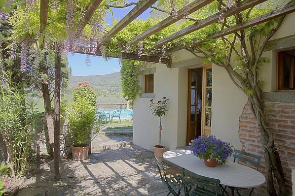 Il patio è di 400 metri quadrati. E' in parte ombreggiato da caratteristiche pergole e da alberi. È attrezzato con un piccolo divano, poltrone e panche in legno e con tavoli, sedie e ombrelloni. Dal patio godrete di un'adorabile vista del verde e della campagna circostante.