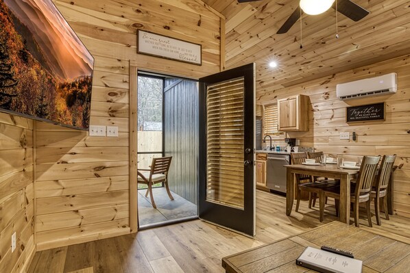 The open living and dining area is bathed in natural light, creating a warm and welcoming ambiance. In the living room, you'll find a generously-sized flat-screen TV, perfect for movie nights or catching up on your favorite shows. For extra accommodation, there's a comfortable sleeper sofa available, ensuring everyone has a cozy place to rest.
