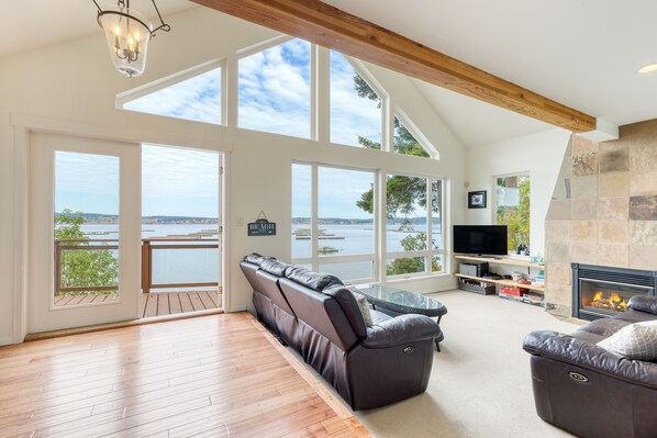 The spacious kitchen is fit for a culinary maestro like you. And when the day winds down, cozy up near the charming gas fireplace in the living area, where we guarantee endless laughter and heartwarming memories. When it's time to rest, each bedroom offers a cozy sanctuary with stunning water views. The sunsets here are unbeatable.