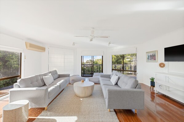 Upon entering, the thoughtfully designed floor plan of Escape Away unfolds, transforming this dwelling into a cohesive haven for multi-generational families or those desiring a spacious holiday retreat. With its expansive windows, the living room is a versatile sitting room or effortlessly converts into a fourth bedroom by simply sliding across the shutters.