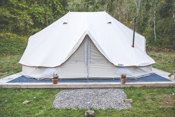 When you’re after a cuppa post-hike, just slide into the covered kitchen outdoors, where there’s a gas cooker and electric coolbox. The tent has a hot shower and toilet, a double bed with a memory foam mattress, a double futon and a tent stove.