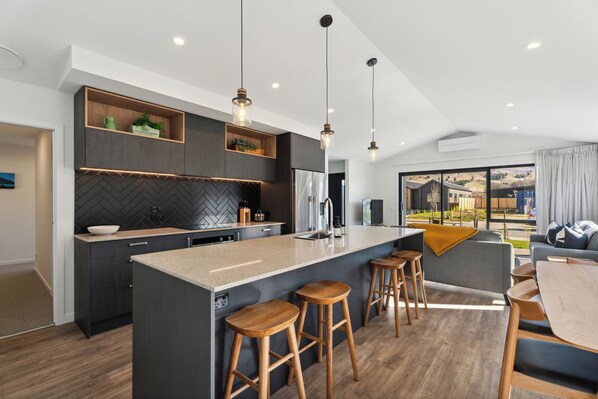 Step inside to an open-plan living area with the perfect gathering space, with its warm, welcoming ambience flowing through the dining area and fully equipped kitchen, complete with a wine fridge where you can stock some of your favourite local vintages.