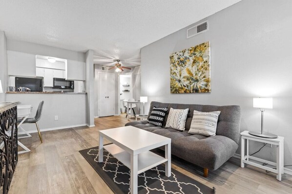 Guests have private access to the entire apartment and patio! Make yourself at home is this urban one bedroom abode with close access to the rest of Dallas! Relax on the couch while enjoying the free WIFI and Smart TV features! Cook yourself a meal in our fully equipped kitchen, and sit on the balcony. Enjoy the free seasonal pool!