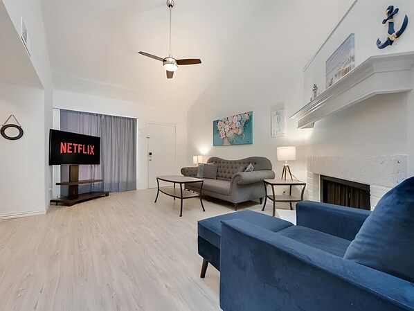 Step into a bright and thoughtfully designed space featuring modern decor, warm tones, and cozy touches throughout. The open-concept living area includes a plush sofa, smart TV for streaming your favorite shows, and fast Wi-Fi to keep you connected whether you're working remotely or planning your next adventure.