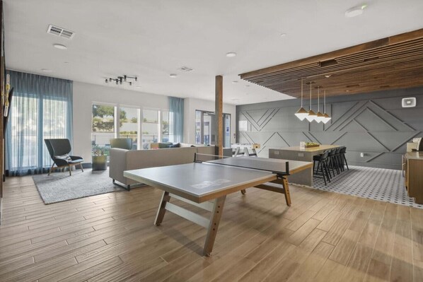 ✅ Modern amenities with hotel-style comfort ✅ Fully equipped KITCHEN with everything you need to cook meals at home, including a full-size fridge, stove, microwave, and cookware. ✅ Pool: Enjoy a refreshing swim in the on-site pool. ✅ Relax on the private PATIO and enjoy access to a BBQ Grill for a fun outdoor cooking experience and an area for a lawn games in the shared common space. ✅ Gym: Stay active with access to the fully equipped gym. ✅ Residents Club: Hang out in the Residents Club, featuring a ping pong table, TV, and comfortable couches for lounging. ✅ Private Balcony: Enjoy your morning coffee or unwind in the evening with a view of the peaceful neighborhood. ✅ Pack `n Play: A convenient Pack `n Play is available for your little one. ✅ 2 KING-Sized Beds🛏️ 💤 + 2 Full Bathroom ✅ 4K 65` HDR Smart TV 📺 + Netflix + High-speed Internet ✅ In-suite Washer/Dryer ✅ Contactless Check-in ✅ All Essential Toiletries Provided ✅ Coffee Maker + Coffee Essentials ✅ Centralized A/C & Heating
