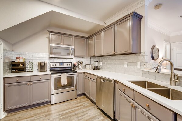 Una TV LCD da 65 "'con 175 canali TV via cavo e Netflix si affacciano sulla zona giorno con un comodo pullman a forma di L abbastanza grande da permettere a tutto il gruppo di rilassarsi e divertirsi riscaldando davanti al camino. Il piccolo ma accogliente cortile dispone di una griglia a gas Weber che ti consente di mostrare le tue abilità alla griglia con la tua famiglia e i tuoi amici mentre ti godi il bel tempo di Dallas.
