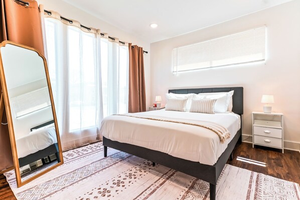 • Super-comfy queen bed with crisp white linens and blackout curtains for restful sleep