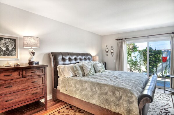 Camere da letto e bagni: la suite matrimoniale è al piano di sotto! C'è anche un bagno per gli ospiti mezzo al piano di sotto vicino all'ingresso. La suite matrimoniale ha un letto Cal King, una TV a schermo piatto e una zona spogliatoio separata con armadi a specchio. Il bagno principale dispone di doppio lavabo con cabina doccia con atrio privato nel cortile.