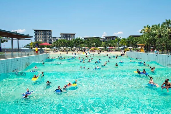 Easy access to restaurants, shops on ground level. Steps from the lagoon, wave pool and convention centre.