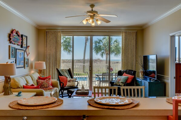 Siamo grati e felici di condividere questo bellissimo condominio e la splendida vista sul Golfo del Messico con i nostri ospiti. Il patio è esattamente a cinque passi da una delle due grandi piscine all'aperto, una è riscaldata (stagionale). Nel cortile, area piscina, troverete un grande gazebo, griglie a carbonella, un paesaggio ben curato e una passerella che conduce alla scintillante spiaggia di sabbia bianca.