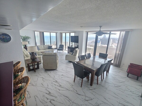 Highly recommend this property! The wraparound balcony was our favorite thing about this condo. We had the most amazing views of both the ocean side as well as Daytona. The unit is very spacious including 2 good size bedrooms with a shared bath and then a gracious master suite with private balcony access. Can’t say enough good things about this property including a very positive experience with the property manager. Definitely plan to return!!