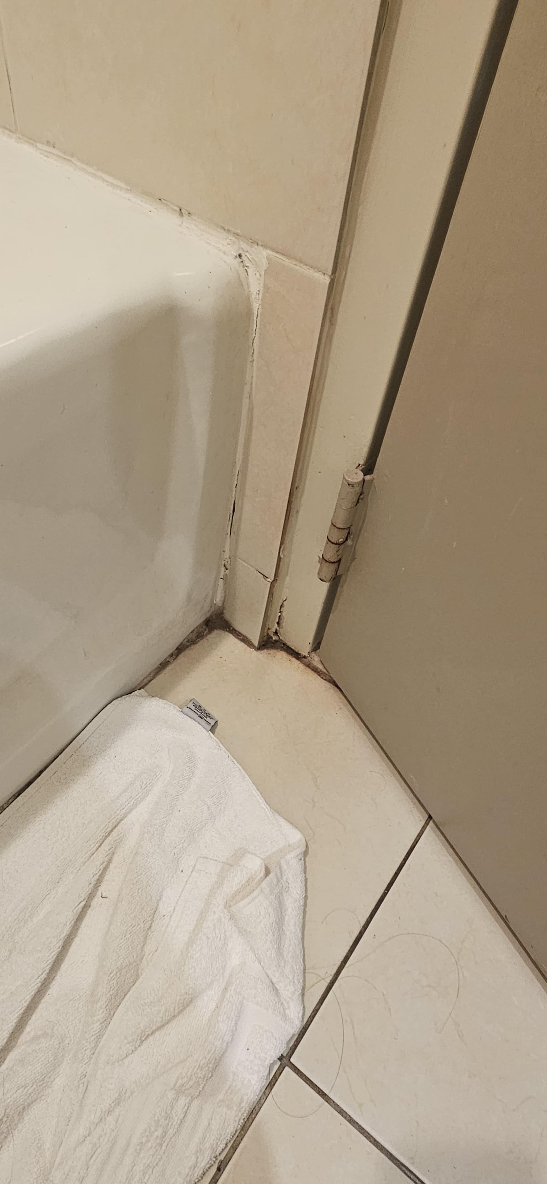 Bathroom had hair on counter and floor from previous stay. Bathroom was dated and grout lines are black and need to be redone. Tiles ae cracked.
