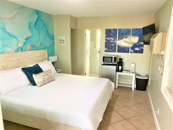 You know that happy post-beach, pre-dinner nap where you wake up feeling utterly refreshed? King Deluxe rooms are designed for exactly that. We pair a large luxurious king-sized bed with ocean-inspired artwork to create the perfect storm for romance and relaxation. Guests love it as a cozy love nest for two.