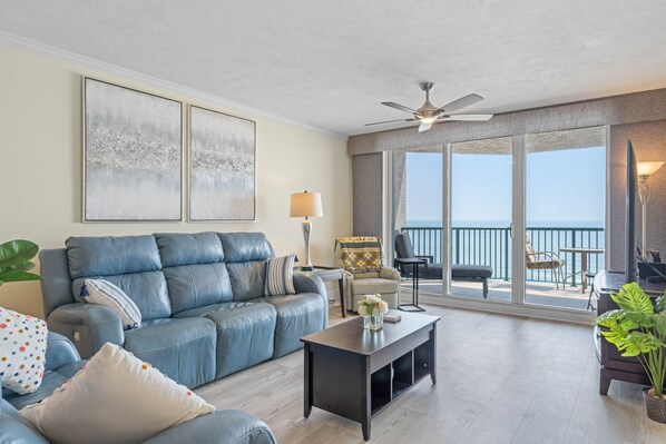 The living room features two reclining leather couches situated around a large smart tv that has cable access overlooking an oceanfront balcony entrance/exit sliding glass door.