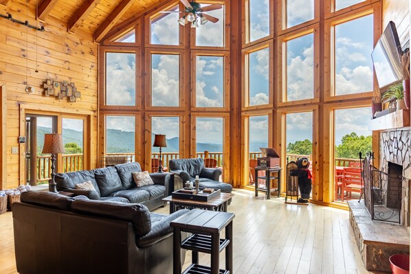 Entra nella cabina con solo 1 scalino dal parcheggio a livello. Passando attraverso il foyer con un attaccapanni incorporato e superando il mezzo bagno nella grande sala con un soffitto con travi a vista alto 20 piedi, sarai sicuro di essere affascinato dalle incredibili viste sulle montagne viste attraverso l'enorme muro di finestre . C'è un sacco di comodi mobili in pelle disposti intorno a un camino in pietra in legno (con limitata legna da ardere in dotazione) con una grande HDTV montata sopra di esso. Inoltre, vi è l'accesso ad una sezione coperta del grande ponte dove la vasca idromassaggio per 6 persone e le viste incredibili saranno sicuramente apprezzate.