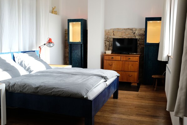 Soffitti alti, ampie finestre (con tende opache), pavimento in assi di quercia, letto king-size (materasso in schiuma fredda di 180 cm di larghezza), aria condizionata (che è molto importante in estate) e TV.