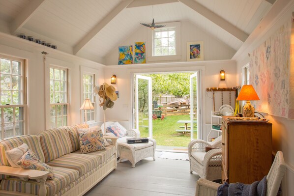 Luce, spazioso e rilassante, il salotto, sala da sole e Den fornire diversi posti a sedere e una vasta biblioteca di libri, film e giochi da tavolo. Si può godere prendere il sole o la lettura al di fuori su una delle tante sedie Adirondack dove ci sono fiori profumati nel cortile e cortile anteriore giardini. Giochi all'aperto sono disponibili e un tavolo da picnic è a posto per un ottimo picnic in famiglia. (Ulteriori tavoli pieghevoli sono disponibili.)