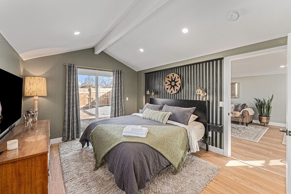 Morning light filters across the patio as you sip coffee beside the colorful mural, the quiet hum of the neighborhood rising with the day. Evenings bring the scent of something on the grill and the glow of the hot tub, where the sky opens wide above. Inside, warm wood floors and soft neutral tones create a calm retreat after a day exploring Denver’s vibrant streets.